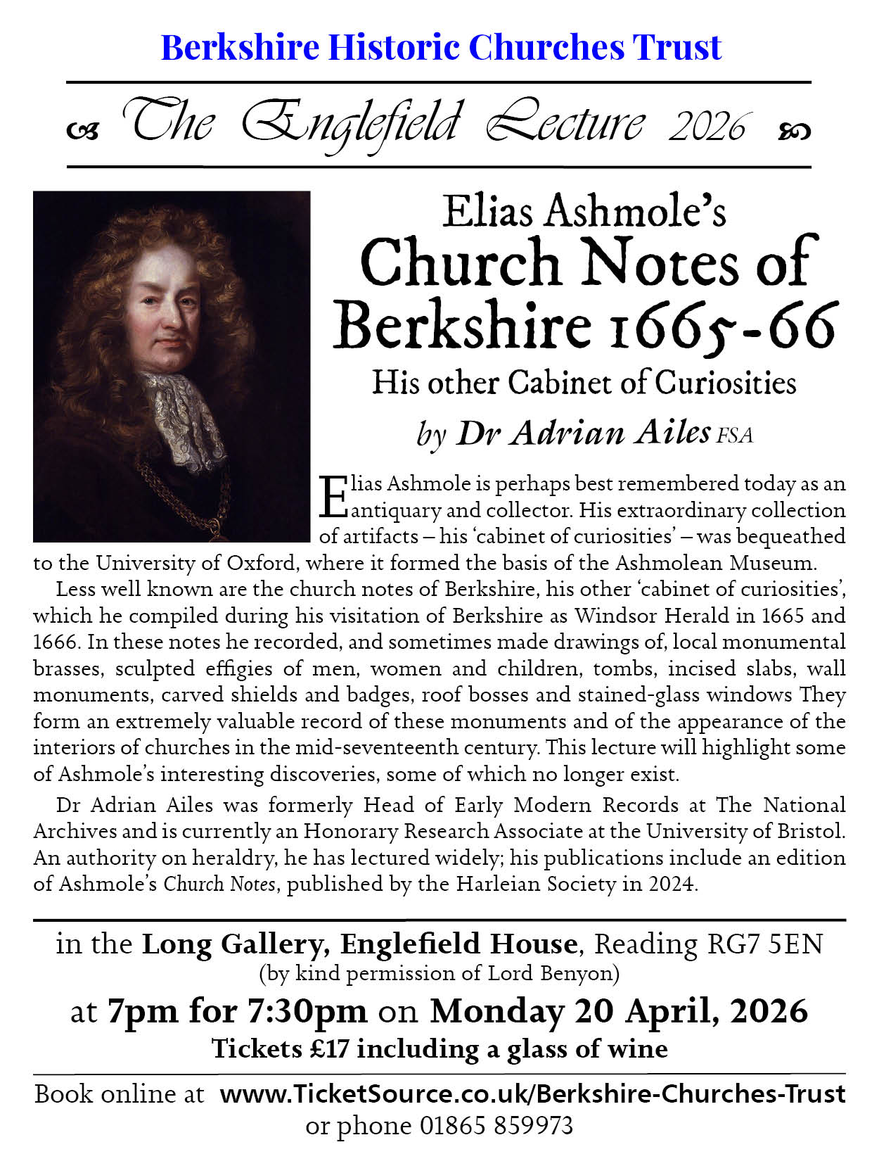 The Englefield Lecture 2026 will be on Monday 20th April at 7:30pm, when Dr Adrian Ailes will talk about “Elias Ashmole’s Church Notes of Berkshire 1665-6“. As Windsor Herald at Arms Ashmole made a formal visitation of Berkshire in 1665-6, noting the pedigrees and arms of the gentry; he also compiled notes on the monuments, effigies, tombs, carved badges and stained-glass windows in Berkshire churches, which forms an extremely valuable record. The lecture is open to all – details are here. Tickets are now available from www.Ticketsource.co.uk/berkshire-churches-trust